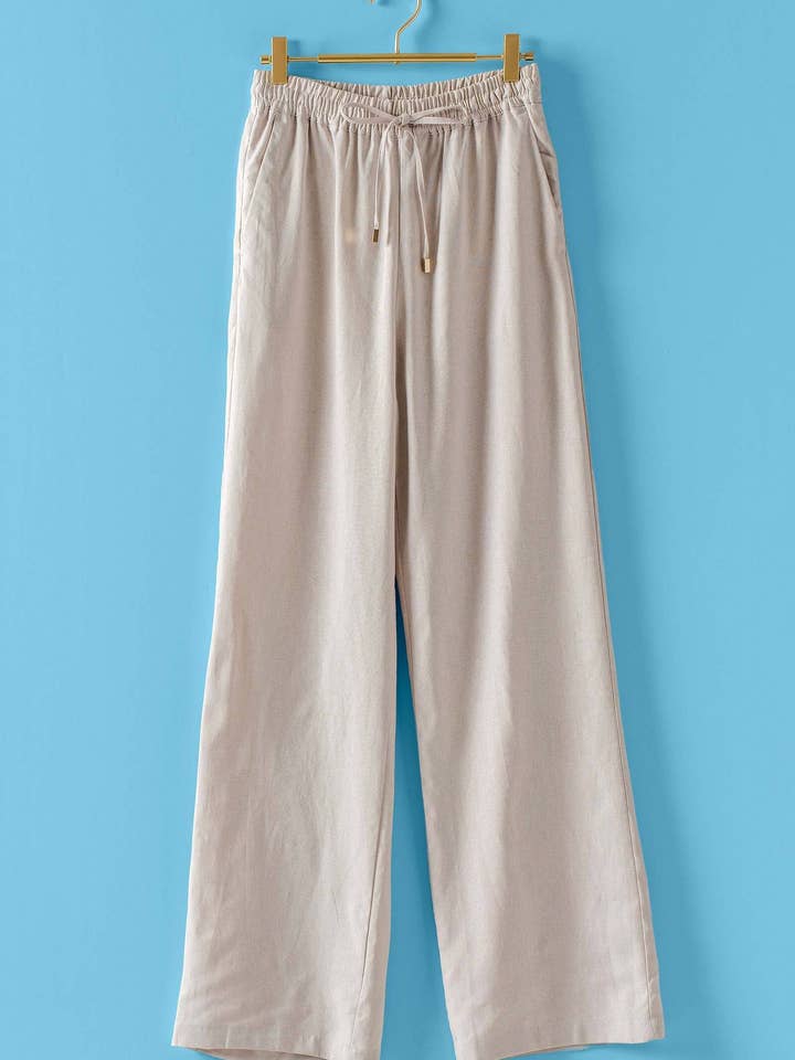 Effortless elegance meets comfort in these wide-leg linen-blend trousers. Crafted from a breathable 55% linen and 45% viscose blend, they feature a relaxed silhouette with a convenient pull-on drawstring waist—no zipping required. Floor-length styling and functional side pockets provide practicality, while polished gold-tone hardware adds a refined touch. Perfect for warm-weather dressing with a sophisticated, laid-back vibe.